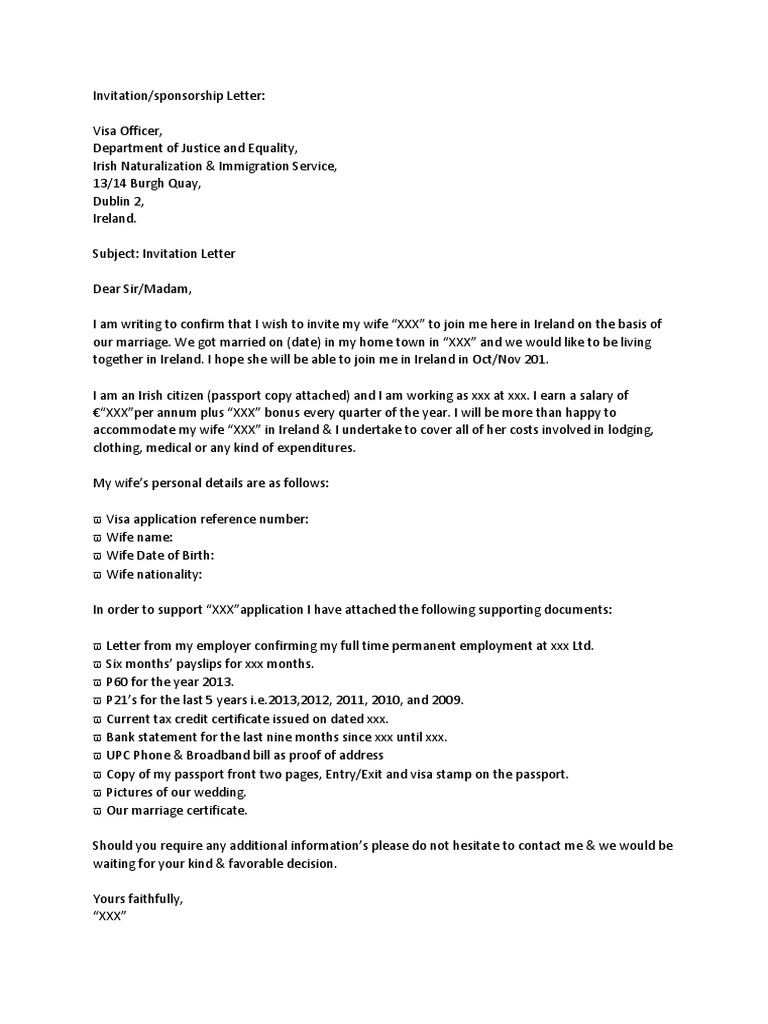 The letter must be signed and dated by the person making the invitation. Invitation before application for schengen visa to be filled in by persons in sweden who wish to invite relatives or friends from abroad fylls i av migrationsverket/ utlandsmyndigheten dossiernummer signatur fill in this form if you wish to invite a relative or friend to visit you for maximum 90 days in a period of 180 days. An ability to use correct english spelling, punctuation, grammar and capitalisation. Government that the person will be staying for a limited time, and ideally have financial support. A letter of invitation for a uk visa is a letter written by a citizen or legal resident of the united kingdom, addressed to a foreigner with whom they have family ties or friendship, inviting them to stay over at their house. Free download of our invitation letter for a visa sample! Replace the red text with your personal information. Legal resident or citizen writes to invite their foreign relative to their home. This is just a sample for your reference, you can modify this sample visit visa invitation letter for ireland as per your requirements. Visa invitation letter ireland sample following is a sample invitation letter for visit visa of ireland. Must have enough room for the applicant or the applicant and his or her family members if the applicant is travelling to ireland with his or her family. Please note only an official invitation issued by police of spain will be accepted. Invitation letter for tourist visa family ireland so for the invitation letter for tourist visa, family or friends must write it for you.